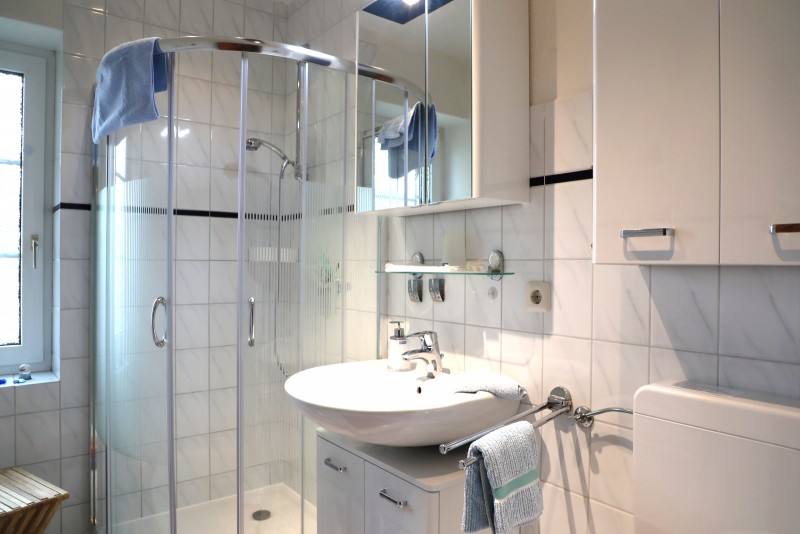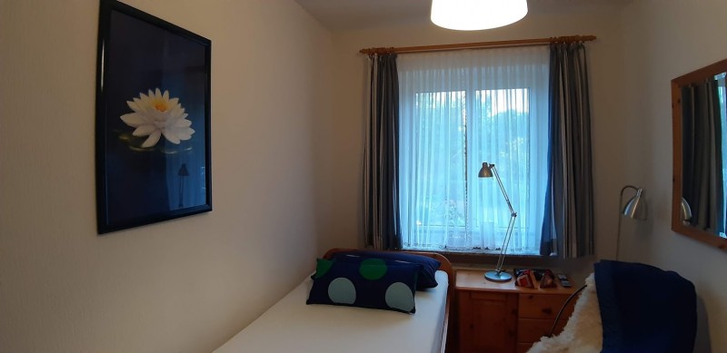 Ein Schlafzimmer Einzelbett, Komforthöhe 0,90 x 2,00 m, verstellbares Lattenrost und Fernseher ,ein Badezimmer mit Dusche/WC/Komforthöhe und 1Gäste-WC.