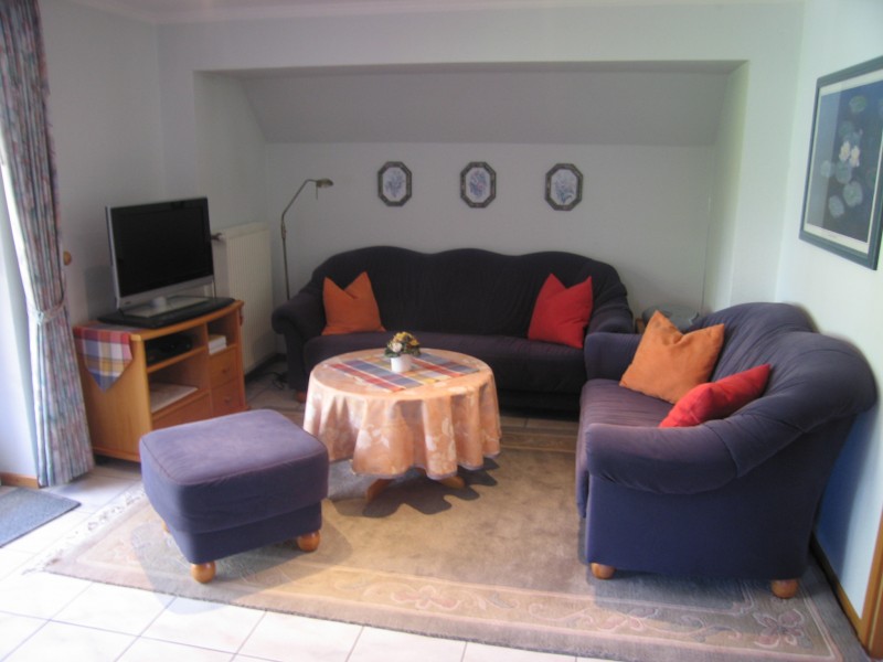 Im Wohnbereich befindet sich eine gemütliche Couchgarnitur, Esstisch, SAT-Flachbild-TV und Radio .